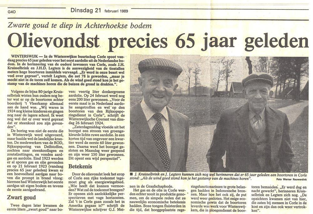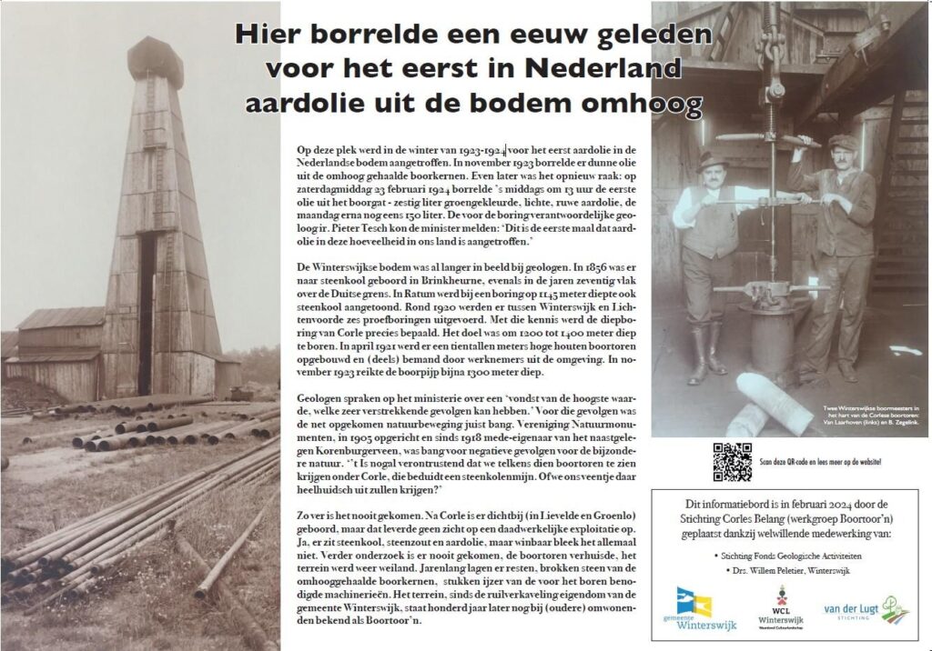 Zo ver is het nooit gekomen. Na Corle is er dichtbij (in Lievelde en Groenlo) geboord, maar dat leverde geen zicht op een daadwerkelijke exploratie op. Ja, er zit steenkool, steenzout en aardolie, maar winbaar bleek het allemaal niet. Verder onderzoek is er nooit gekomen, de boortoren verhuisde, het terrein werd weer weiland. Jarenlang lagen er resten, brokken steen van de omhooggehaalde boorkernen, stukken ijzer van de voor het boren benodigde machinerieën. Het terrein, sinds de ruilverkaveling eigendom van de gemeente Winterswijk, staat honderd jaar later nog bij (oudere) omwonenden bekend als boortoor’n.